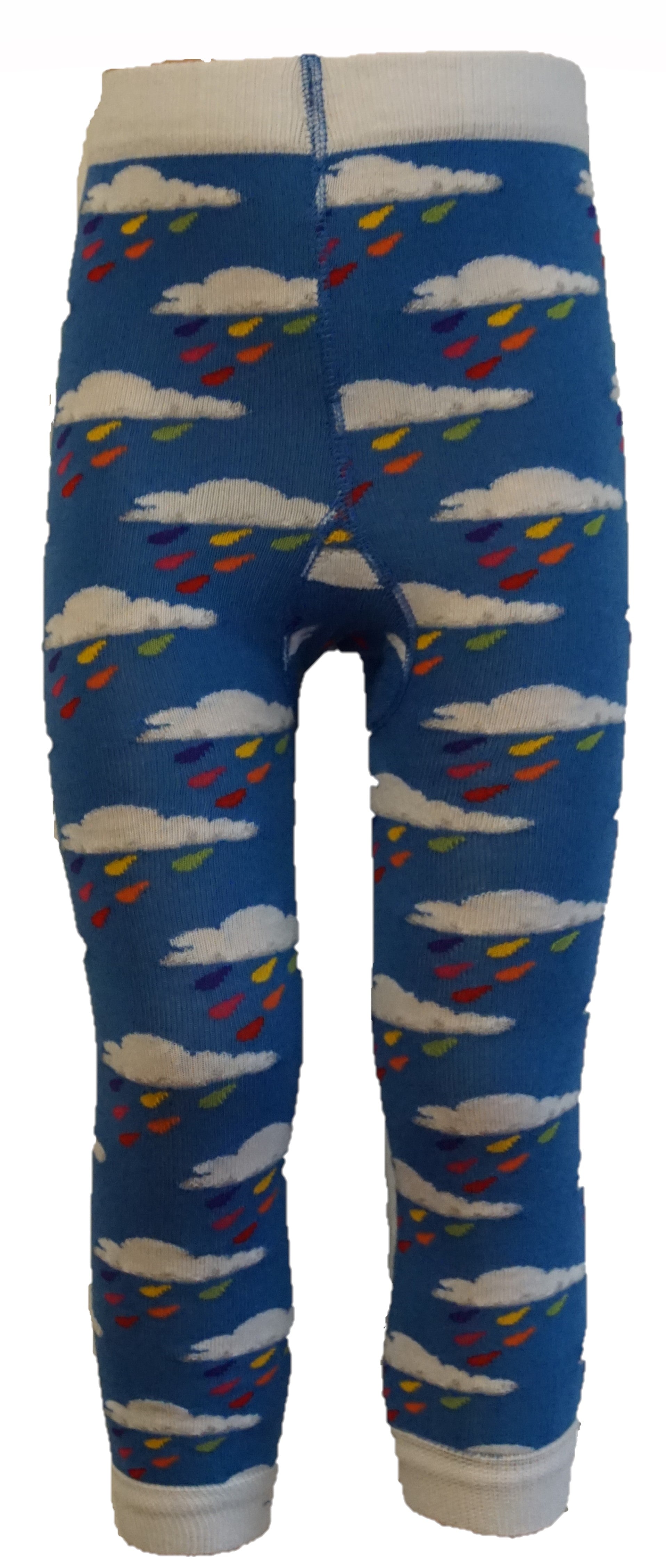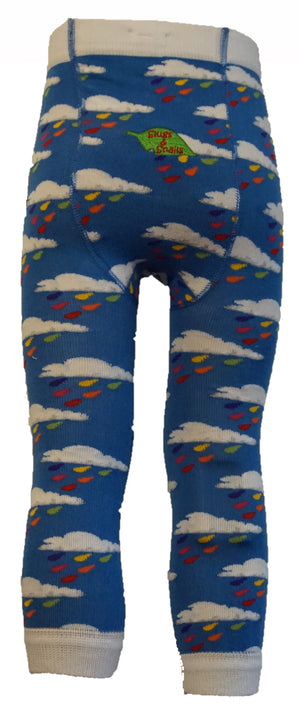 Blue footless tights or leggings with clouds and raindrops made of GOTS certified organic cotton.